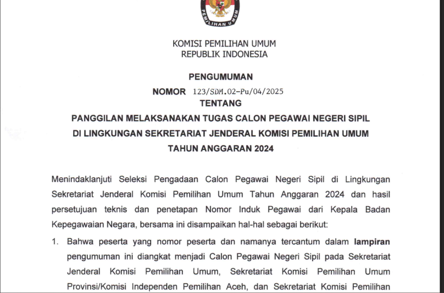Pengumuman Nomor 123/SDM.02-Pu/04/2025 tentang Panggilan Melaksanakan Tugas Calon Pegawai Negeri Sipil di Lingkungan Sekretariat Jenderal Komisi Pemilihan Umum Tahun Anggaran 2024.