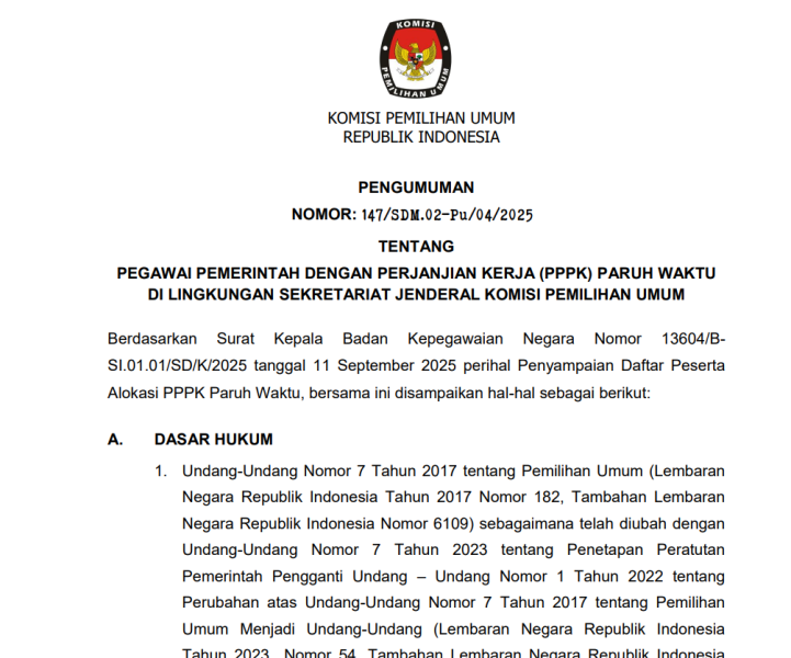 Pengumuman nomor 147/SDM.02-Pu/04/2025 Tentang Pegawai Pemerintah Dengan Perjanjian Kerja (PPPK) Paruh Waktu di Lingkungan Sekretariat Jenderal KPU..