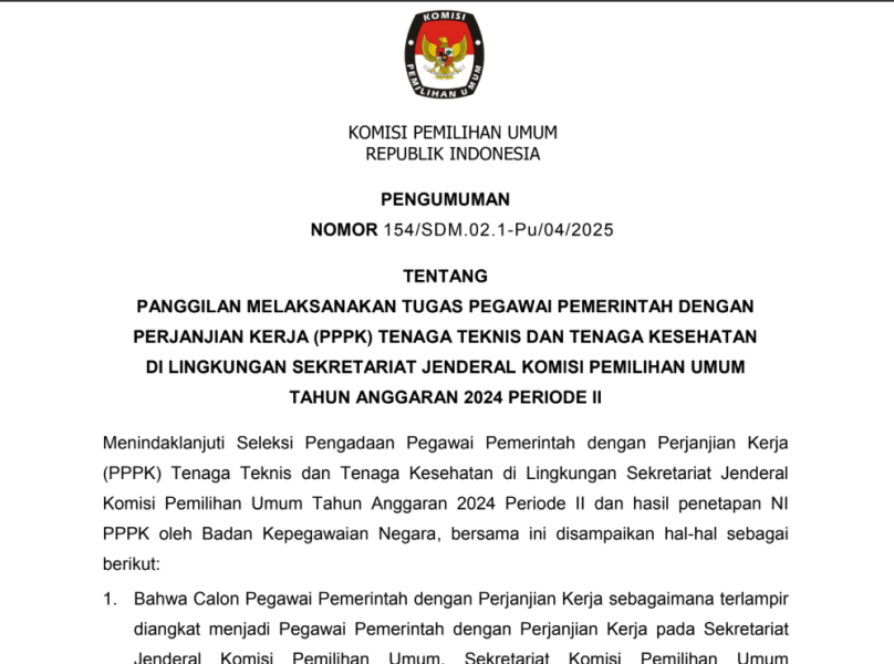 Pengumuman nomor 154/SDM.02.1-Pu/04/2025 TePengumuman Panggilan Melaksanakan Tugas Tentang Pegawai Pemerintah Dengan Perjanjian Kerja (PPPK) di Lingkungan Sekretariat Jenderal KPU Periode II..