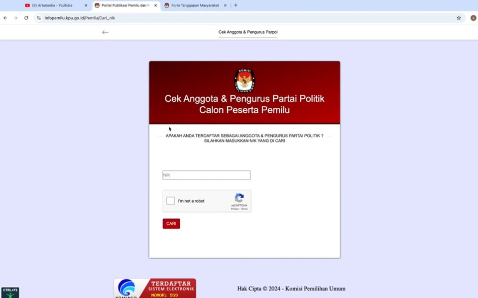 - Klik Cek Anggota Parpol dan masukkan NIK Anda.