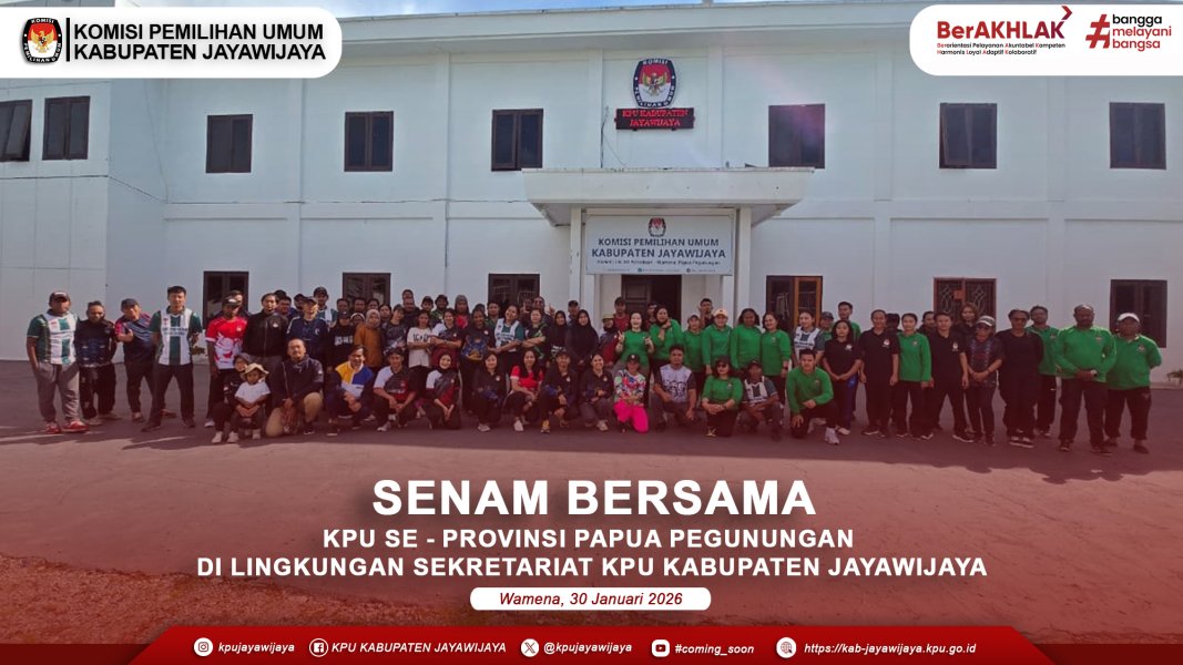 Jayawijaya, Jumat (30 Januari 2026) — Komisi Pemilihan Umum (KPU) Kabupaten Jayawijaya melaksanakan Senam Pagi Bersama KPU se-Provinsi Papua Pegunungan yang berlangsung di halaman Kantor KPU Kabupaten Jayawijaya. Kegiatan ini diikuti oleh jajaran KPU kabupaten/kota se-Papua Pegunungan serta pegawai di lingkungan KPU Kabupaten Jayawijaya.